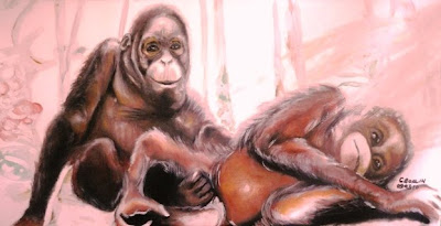 Meet Tiger and Tompong... :) Tiger is a 10 years old male orangutan and Tompong is a 8-year-old female. If you look at the drawing, they are both doing their favourite pastime; mating attempts, as they both are still juveniles and are quite young to engage in such a subadult/adulthood activity. Male orangutans, in average, reach puberty in the age of 13-15 years old, while the females are sexually active when they reach 11-13 years of age, in average; much earlier than the males... Almost similar to humans I must say. Another interesting fact is, they mate the whole year round (just as humans do), and the gestation period or pregnancy takes in approximate eight and a half months.